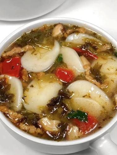 鹹齏年糕湯是用鹹鮮酸爽的鹹齏,配上軟糯爽滑的年糕片,再加鮮嫩爽脆的冬筍絲烹煮而成,熱氣騰騰、鮮香四溢,一碗下肚整個人都溫暖了起來。