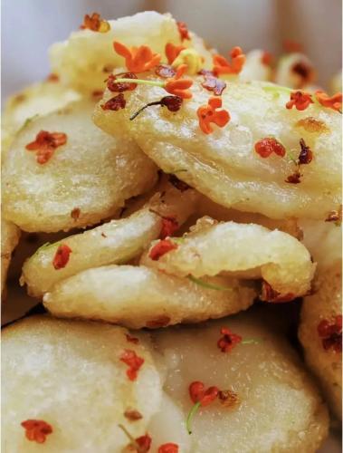 熱鍋裡一勺清油,一邊大火翻炒一邊撒入桂花糖,曬乾的桂花粒在熱氣的衝擊下迅速舒展著花瓣,直到每一片年糕都被馥郁的香氣包裹。來一口色澤金黃、表皮酥脆、香甜軟糯的桂花糖炒年糕,就能體會到幸福的滋味~