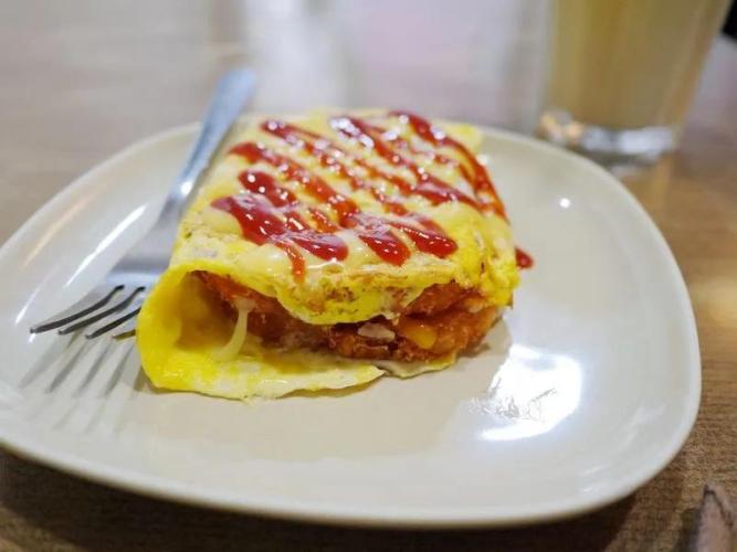 在蛋餅皮裡麵包上自己想吃的料,如:玉米、起司、火腿……等。除了基本的口味,各家早餐店也有推出不同的口味,可以都去試試看唷!不過也有另一種叫蛋捲,意思是把蛋餅皮換成蛋,用蛋去包餡料,有點類似蛋包飯的概念唷!