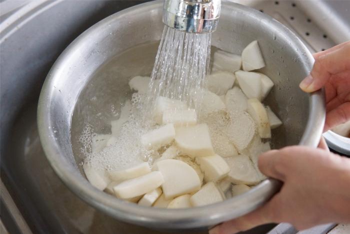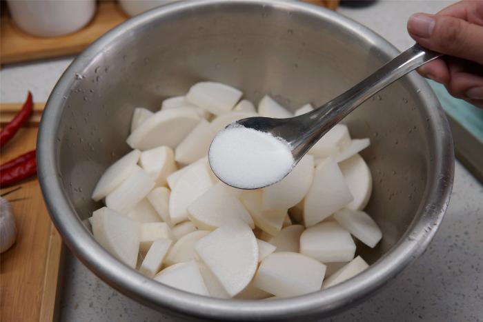 醃好的蘿蔔想要脆爽可口,最重要的就是「殺」出蘿蔔中的水分,蘿蔔加鹽後最少醃製30分鐘,等待水分析出後倒掉,多用手擠壓蘿蔔,這一步千萬不要嫌麻煩,一定要擠壓乾淨水分,蘿蔔才吃起來更脆,同時也能去掉蘿蔔的辛辣味。