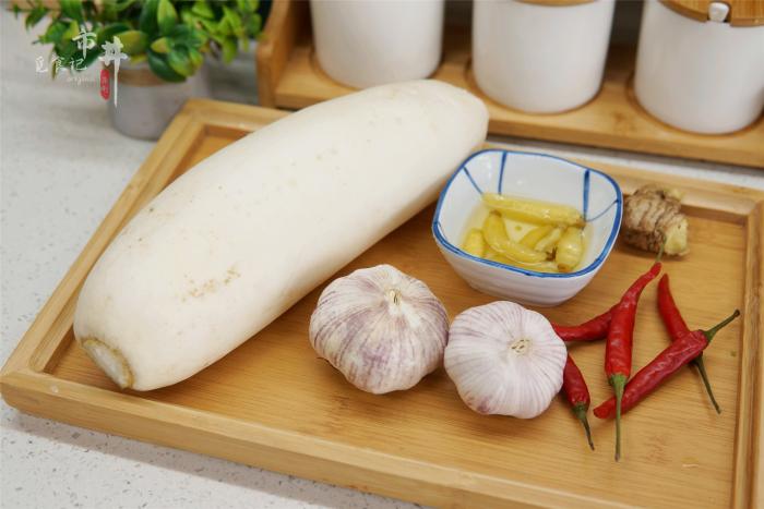 所需食材:白蘿蔔2根,大蒜2頭,小米椒5根,泡椒5根,姜1塊。