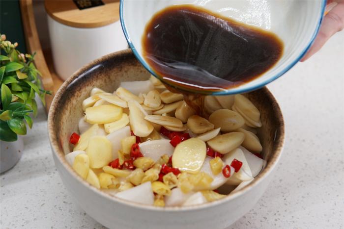 7、找一個乾淨的容器,倒入蘿蔔片,切好的大蒜、生薑、小米椒、泡椒,最後倒入調好的料汁,料汁要完全沒過蘿蔔,這樣才能入味,最後封上保鮮膜,醃製3—5小時即可,一盤爽脆下飯的醃蘿蔔就做好了。