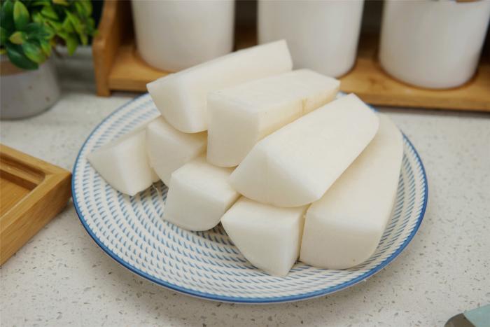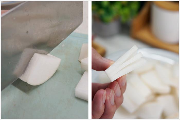 1、醃蘿蔔最重要的就是食材的選擇,要購買水分充足、口感脆爽的蘿蔔,蘿蔔清洗乾淨後去頭去尾,將蘿蔔從中間切開後再一分為二,切成四等份。