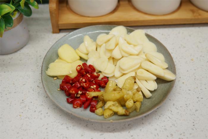 4、醃製蘿蔔的時間,可以準備其它的配料,大蒜、生薑去皮後切片,小米椒切圈,泡椒切段。