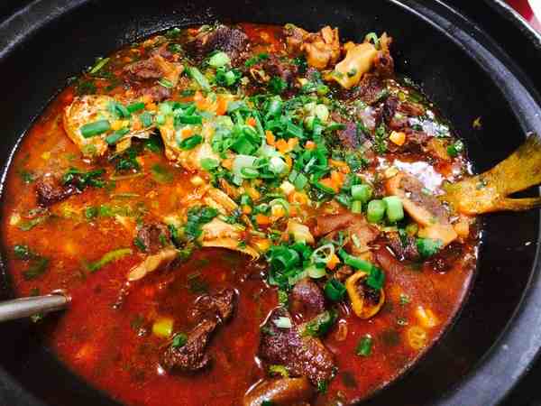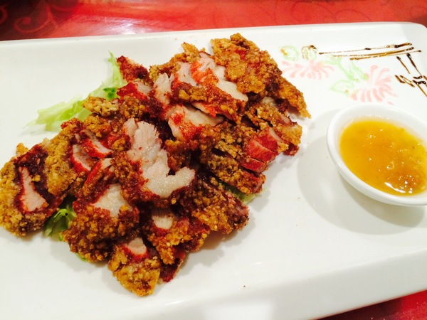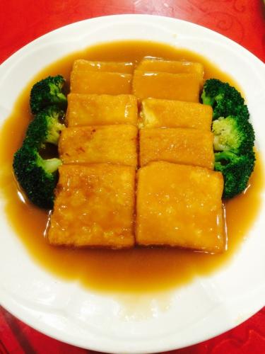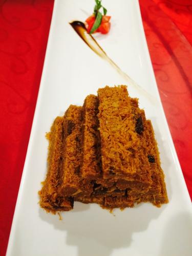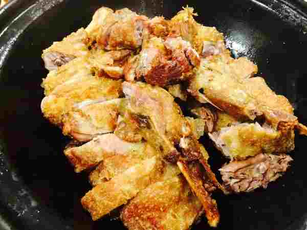 端上來的時候服務員,往碗裡倒醬料,頓時香味溢位,拍照的時候都忍不住咽口水。鴨肉涮上一層雞蛋,底下有石頭,名副其實的石烹鴨,鴨肉嫩而不柴,有雞蛋味很酥脆。很特別的一道菜。