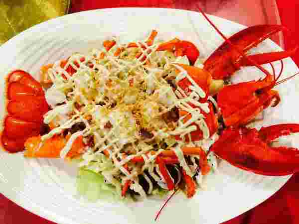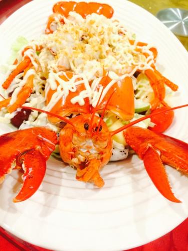 之前在別家也吃過龍蝦沙拉,但是這樣一整隻波士頓龍蝦,加無數水果上來一大盤,真是震撼到了現場。新鮮的龍蝦拌上沙拉醬,口感獨特,裡面火龍果,提子,蘋果生菜等的涼拌沙拉非常開胃,適合炎炎夏日。