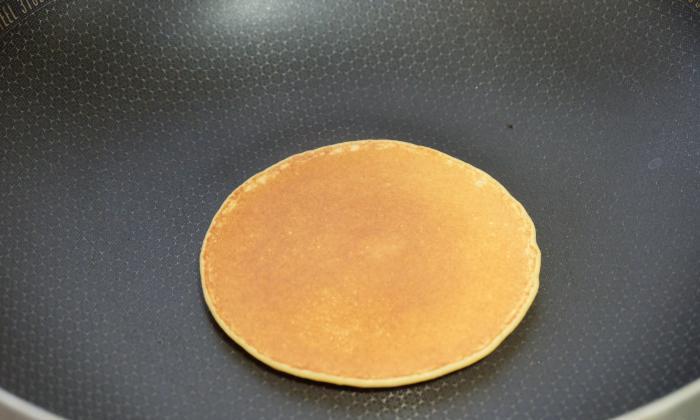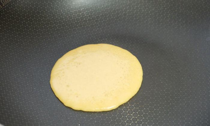 6、因為鍋底是熱的,麵糊流動的過程中被加熱,很快就停止流動,固定形成了一個圓餅形狀。四周受熱後會凝固變色,等到變色的範圍加大後,底部熟透,再翻面;