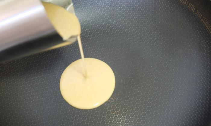 5、平底鍋上火燒熱,鍋底燒熱,將拌好的鬆餅麵糊倒入鍋裡。倒的時候固定一個點垂直落下,麵糊是有流動性的,會自動流動成一個圓形,達到自己想要的大小時,即可停止倒入麵糊;