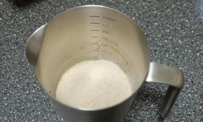 4、最後把全麥麵粉倒進量杯裡,繼續攪拌均勻;