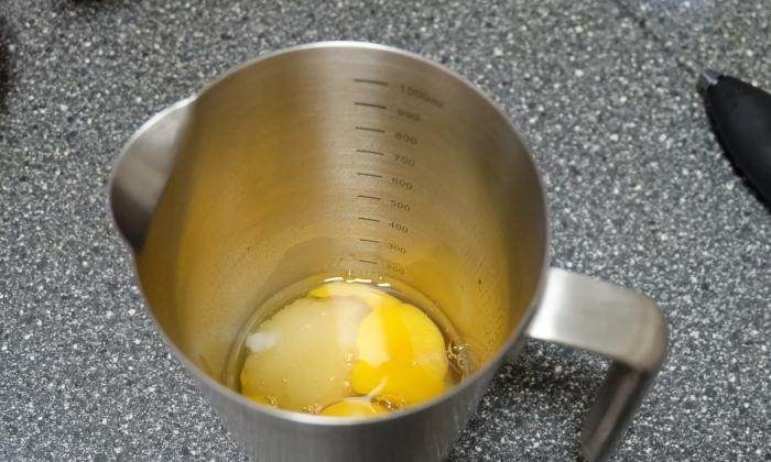2、把雞蛋打在一個量杯裡, 再加上蜂蜜,用筷子或者手持攪拌器攪拌均勻。如果沒有廚房用電子秤,建議使用這種內壁帶刻度的量杯,也能夠相對準確地測量出食材的用量;