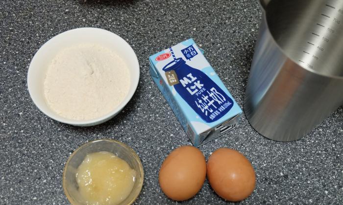 配料表:雞蛋2個、蜂蜜40g、純牛奶90g、全麥麵粉100g;