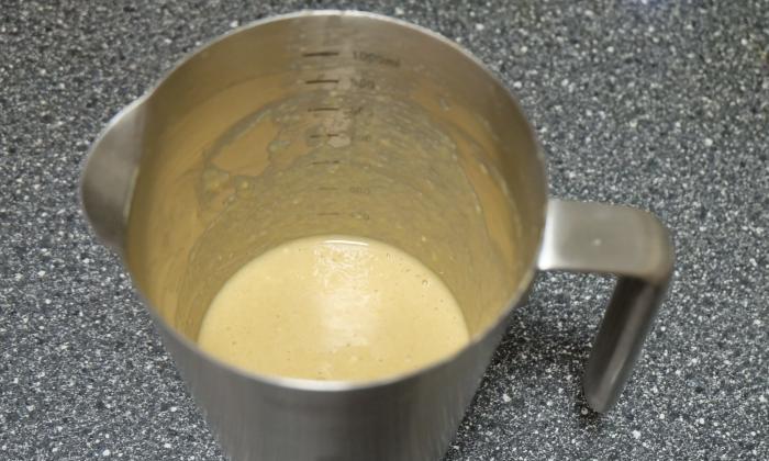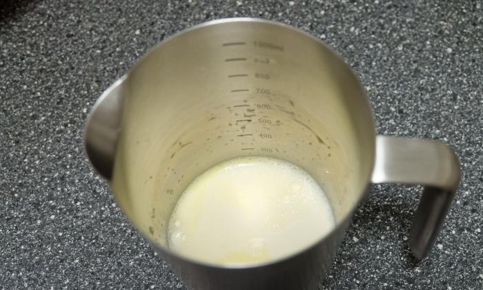 3、再把純牛奶倒進量杯裡,繼續攪拌均勻;