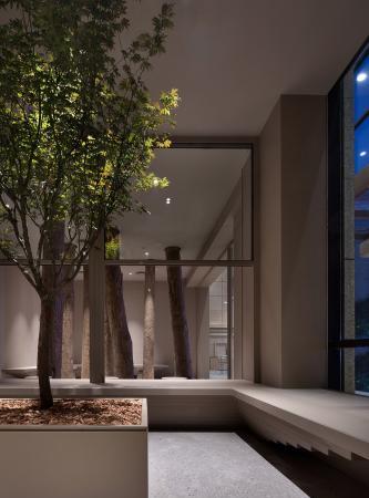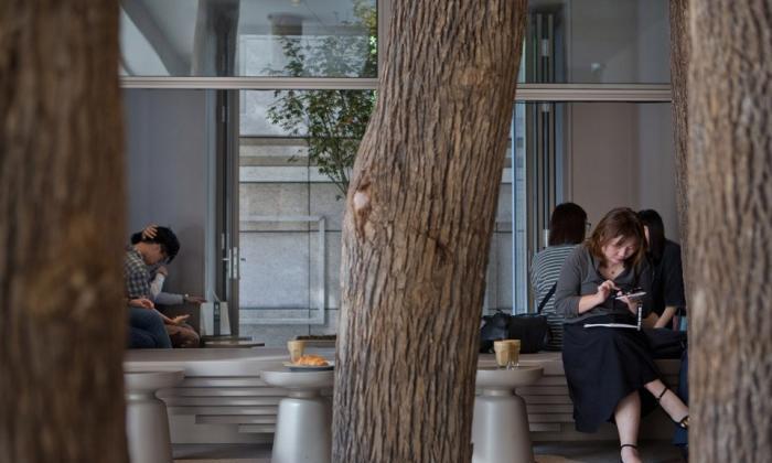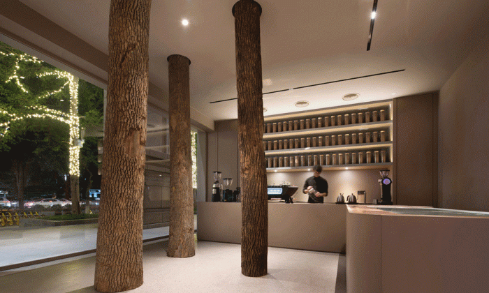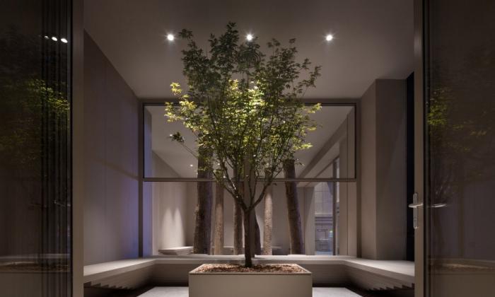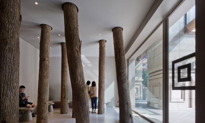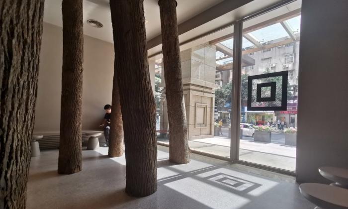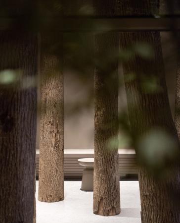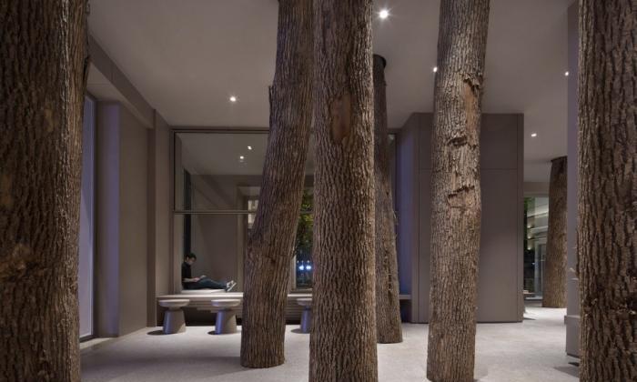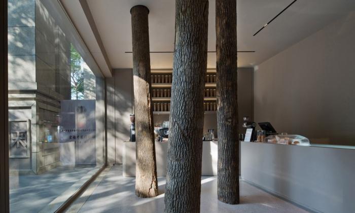 整面玻璃創造良好的視覺體驗,三根樹幹劃分空間,glass facade creates a better visual experience while the trunks define the space