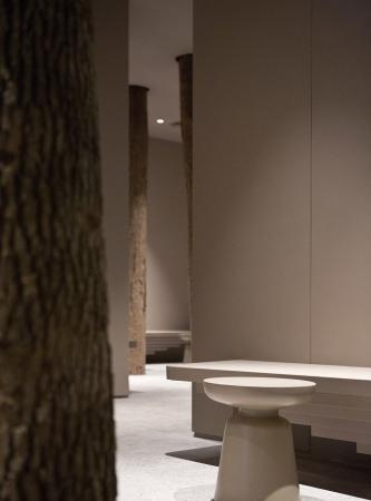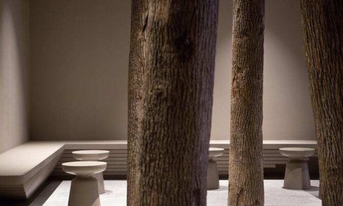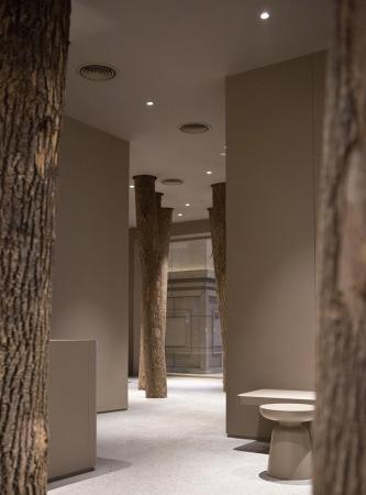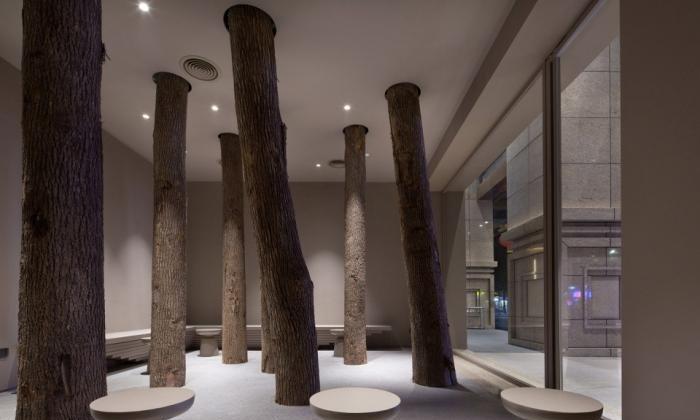 自然是自由的,被剝奪生命的樹幹也是自由的,讓樹幹重新融入新空間煥發生命,錯綜複雜是自然的規律,沒有約束才能得到自由,所以空間選取了十根被拋棄的樹幹重新注入生命,以此能給別人帶來更多思考。