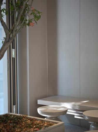 L-shaped bar adds additional use area to form an enclosed space for baristas and customers. This space shows three different materials of the same color to explore the slight changes in the lighting environments of different materials. The aluminum plate of the cabinet, the wallpaper of the wall,the coating of the ceiling and the skin of seat, the three materials in the illumination of the light, create an interesting block relationship.