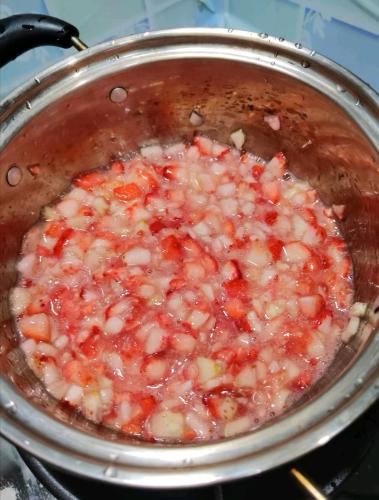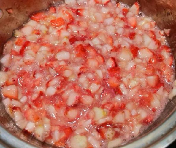 將醃製好的草莓連同糖水一起倒入鍋中,大火煮沸,再用小火慢慢熬煮,期間不斷攪拌以防止粘鍋。