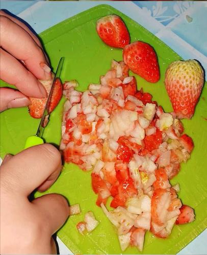 將切好的草莓放入一個大碗中加入白砂糖,攪拌均勻,靜置半小時以上以便果膠析出。