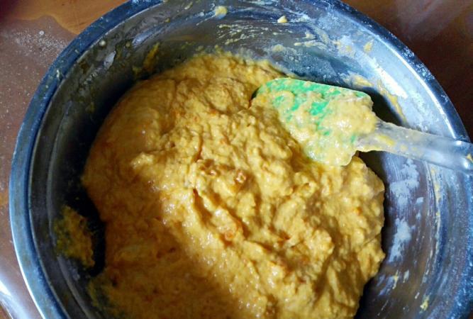 步驟二:南瓜泥壓好後加入麵粉、酵母,接著再打入1個雞蛋,然後還是一邊倒入溫水,一邊用小鏟子攪拌,直至將麵糊攪拌均勻細膩,沒有顆粒為止。最後,蓋上保鮮膜,靜置發酵,當體積膨脹至兩倍大小時就好了。