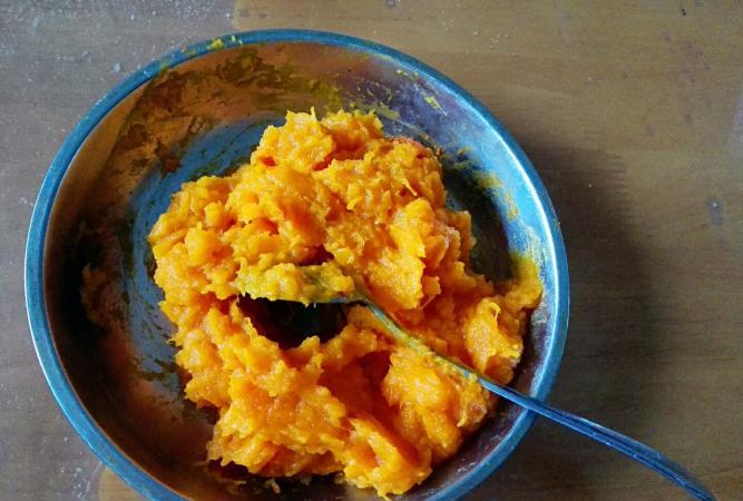 步驟一:首先將南瓜去皮去瓤,然後切片薄片,上蒸鍋大火蒸熟後取出,用叉子或者是勺子按壓成南瓜泥。按壓南瓜泥的時候,趁熱將白糖加入其中。