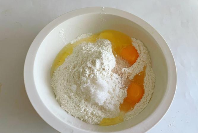 步驟一:首先按照比例將麵粉、白糖以及酵母全部倒入碗中,接著再打入2個雞蛋,最後一邊倒入溫水,一邊用筷子按順時針攪拌均勻。