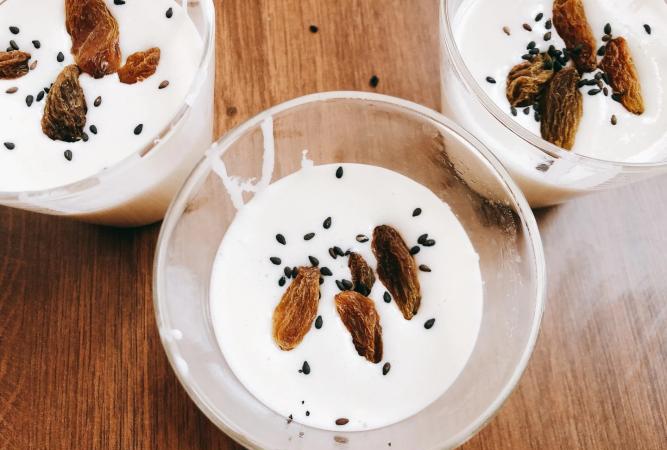 步驟三:將小碗或者模具中刷上一層熟油,防止粘連,接著把發酵好的麵糊倒入小碗中。注意:不要倒滿,差不多七分左右即可,接著再撒入少許的黑芝麻和葡萄乾點綴一下。